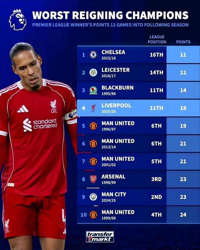 利物浦在本轮英超焦点战主场0-3完败诺丁汉森林的,12轮联赛后仅积18分的,《转会市场》统计显示他们也是同期战绩第4差的英超卫冕冠军分数的。