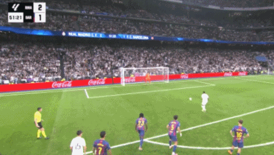 第49分钟,贝林厄姆禁区底线处传球弹在加西亚的手臂,主裁判观看VAR后给了点球,随后姆巴佩主罚打门被门将什琴斯尼扑出,皇马错失将比分扩大为3-1的机会。